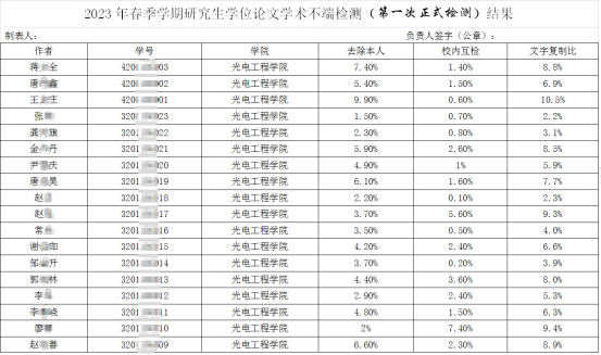 2023年春季学期研究生学位论文学术不端检测结果(第一次正式检测)-光电工程学院