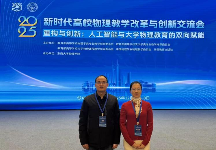2025年12月5-8日,由教育部高等学校物理类专业教学指导委员会、高等教育出版社等主办、东南大学物理学院承办的“2025年新时代高校物理类教学改革与创新交流会”在南京顺利举行。本次会议以“重构与创新:人工智能与大学物理教育的双向赋能”为主题,吸引了全国多所高校的物理教师、教育研究者及专家学者参会。学院高秀英老师和郭强老师应邀参会,与各界代表共同探讨人工智能时代大学物理教育的发展路径。
