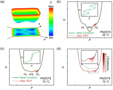 图4 二维Ginzburg-Landau-Devonshire模型。(a)自由能等值线示意图;(b)PNZST5陶瓷中自由能与极化强度的关系曲线;(c)PNZST8陶瓷在略高于相变温度时自由能与极化强度的关系曲线;(d)极化后,PNZST8陶瓷在略高于相变温度时自由能随弛豫时间变化规律。