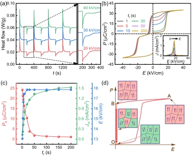 图3 PNZST8反铁电陶瓷在略高于相变温度时的极化行为和电卡效应。(a)不同电场下的等温热流曲线;(b)自定义电场激励模式下的电滞回线;(c)初始极化强度、最大电流密度值及其对应电场随弛豫时间的变化曲线;(d)微结构演变示意图。